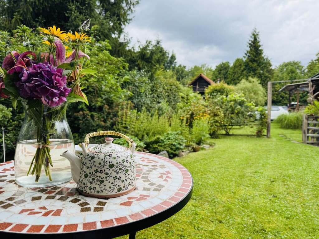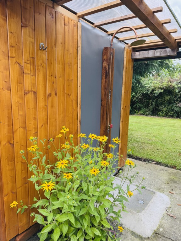 zahradní sprcha, která v teplých parných dnech osvěží. Z terasy se pak jde rovnou do