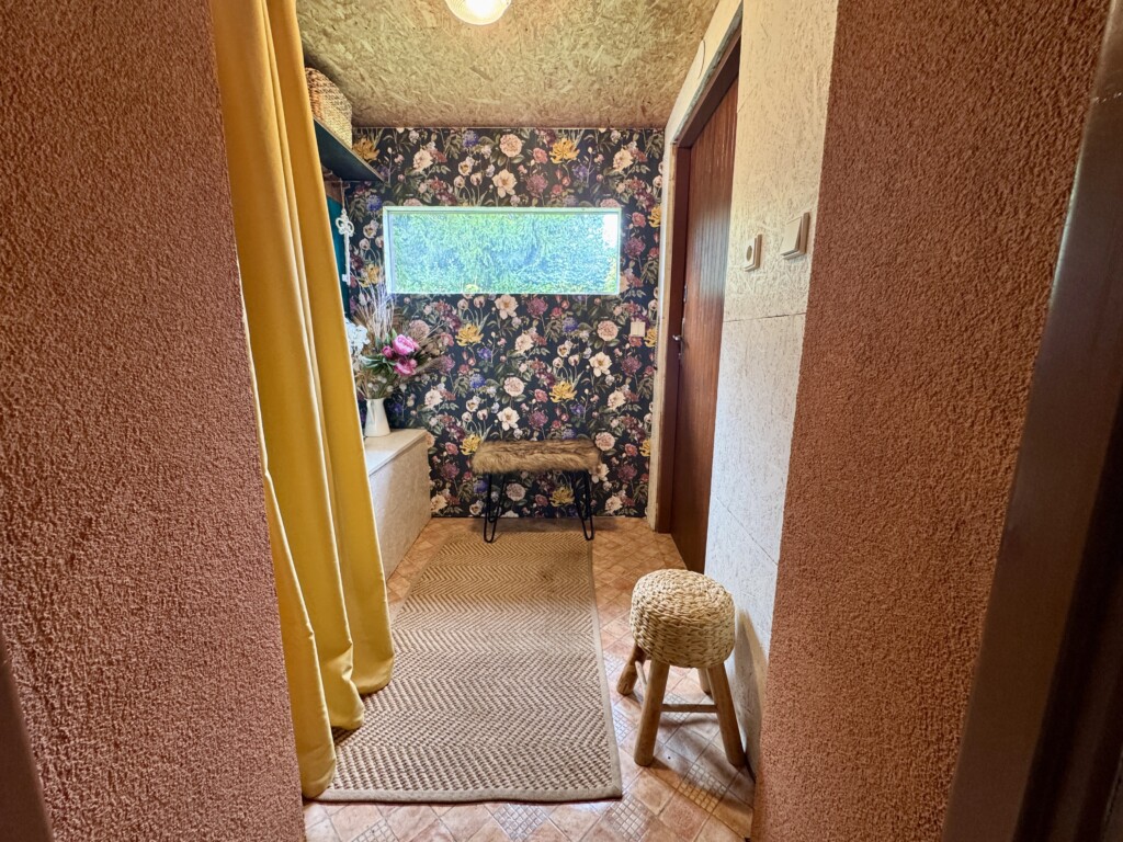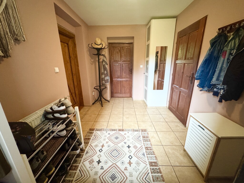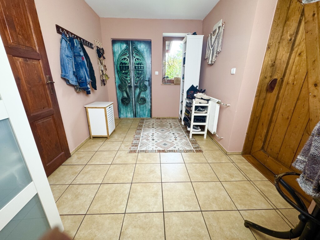 Dispozice domu: Při vstupu je zádveří, za dalšími dveřmi prostorná předsíň se