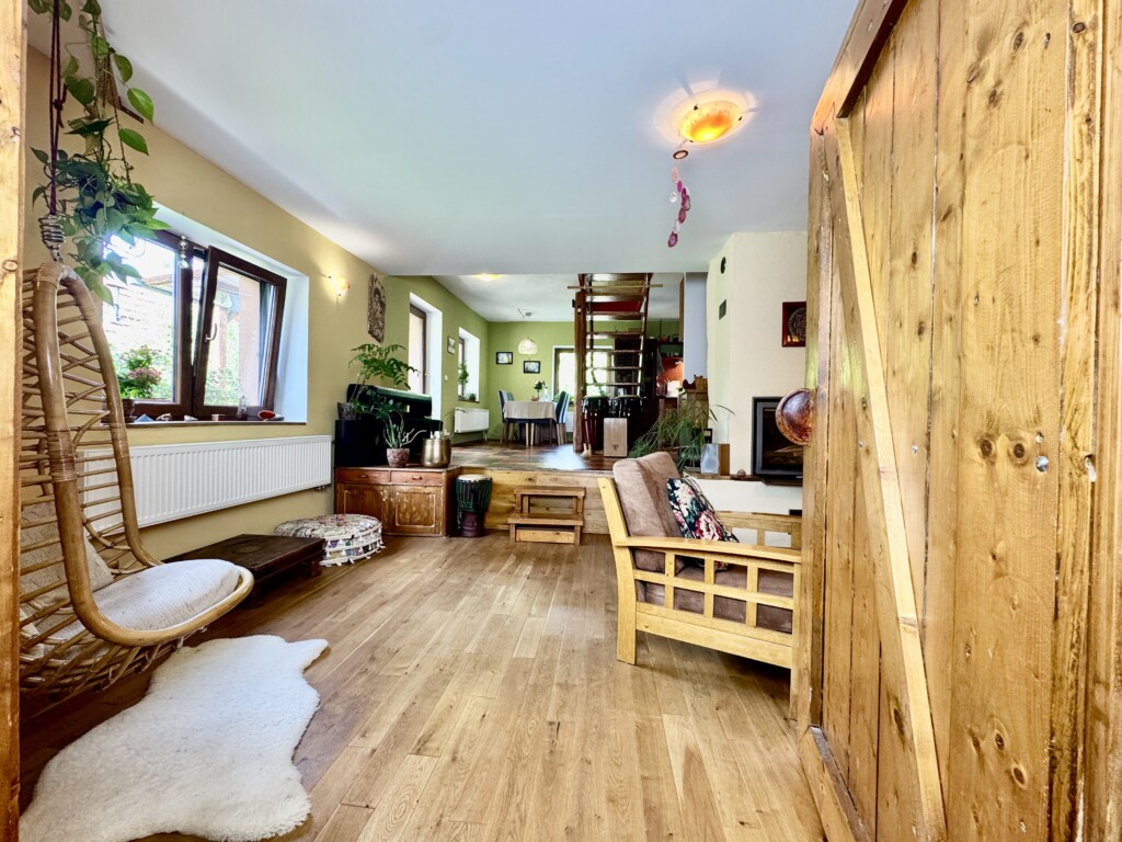 Ve spodním podlaží je z předsíně také vstup do obývacího pokoje s jídelnou a