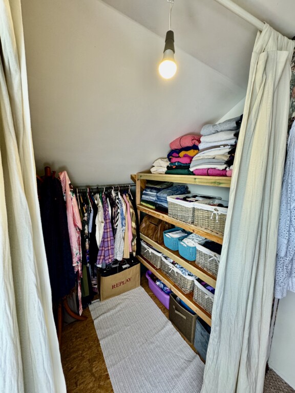 Po schodech nahoru se dostáváme k dětskému pokoji, chodbě s úložnými prostory a