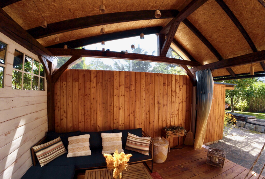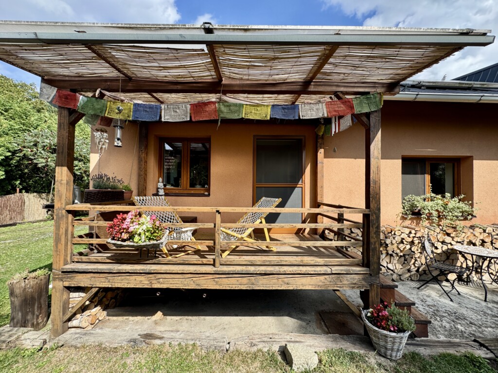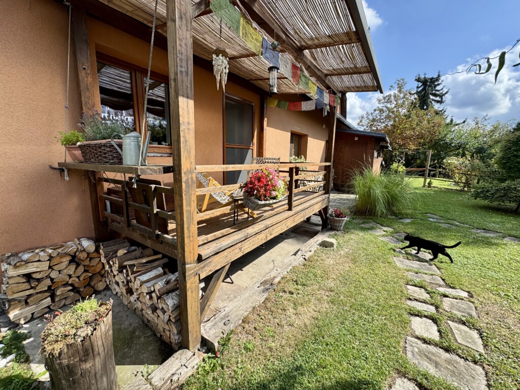 Terasa za domem s dřevníkem byla dokončena v r. 2025.