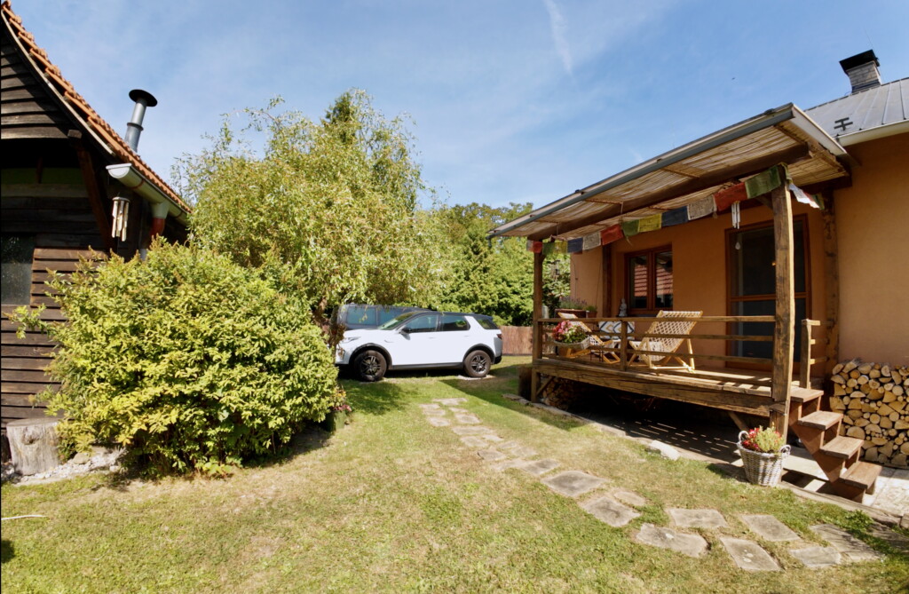 Před domem jsou parkovací místa až pro čtyři vozy. Dům je celý oplocen.